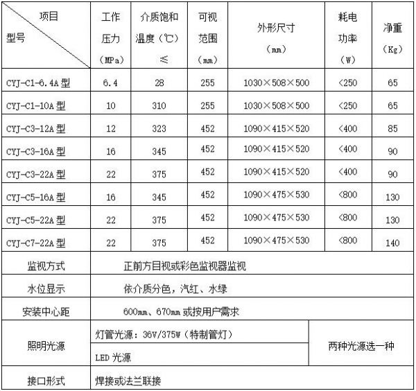 `CYJ型窗式高壓、超高壓彩色液位計(jì)是用于各發(fā)電廠、石油化工行業(yè)及各工礦企業(yè)的蒸汽鍋爐或其它壓力容器監(jiān)測(cè)水位的一次就地直讀儀表。它是在總結(jié)國(guó)內(nèi)外各種透射式雙色水位計(jì)優(yōu)點(diǎn)基礎(chǔ)上新研制的長(zhǎng)窗式高壓、超高壓雙色水位計(jì),用汽紅水綠顯示液位,無(wú)水全紅、滿水全綠。紅綠色界面即為實(shí)際水位??稍诂F(xiàn)場(chǎng)直接觀察也可以配我公司生產(chǎn)的彩色工業(yè)電視監(jiān)視系統(tǒng),在控制室內(nèi)的監(jiān)視器熒屏上遠(yuǎn)程監(jiān)測(cè)現(xiàn)場(chǎng)實(shí)際水位。它與其它雙色水位計(jì)相比較,具有如下幾種特點(diǎn):