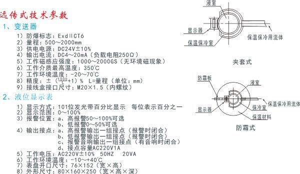 UHC型遠(yuǎn)傳式磁浮液位計是專為監(jiān)控各種壓力容器的液位而設(shè)計的專利產(chǎn)品,它可以用在各種容器上進(jìn)行液位的測量及顯示。本儀表由現(xiàn)場磁浮式液位計,磁耦式位移傳動器,磁耦式液位變送器及控制室內(nèi)液位顯示表四部分組成。磁浮式液位計利用連通器原理同容器連接,從液位計的液位指示器上可直接觀測到液位的變化,同時磁耦式位移傳動器和液位變送器通過電磁轉(zhuǎn)換把液位信號轉(zhuǎn)換成電信號,通過電纜傳輸?shù)娇刂剖覂?nèi)的液位顯示表中,經(jīng)電路處理后在顯示表上利用發(fā)光帶模擬顯示液位,顯示同現(xiàn)場的液位變化同步。顯示表還具有高液位,低液位報警及控制 輸出等項功能?,F(xiàn)場磁耦式液位變送器為隔爆型設(shè)計,防爆標(biāo)志為ExdⅡCT6,產(chǎn)品經(jīng)儀器儀表防爆安全監(jiān)督檢查站審查合格。該產(chǎn)品適用于石油、化工、電站及其它工業(yè)領(lǐng)域的各種容器中液位的監(jiān)測及二次顯示。
